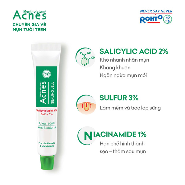 Gel giảm mụn đầu trắng và mụn đầu đen Acnes Sealling Jell 18 g được nghiên cứu và phát triển phù hợp cho mụn đầu trắng và mụn đầu đen. Sản phẩm kết hợp các hoạt chất Salicylic Acid, Sulfur và Niacinamide, hiệu quả trong việc làm khô nhân mụn, giúp nhân mụn thoát ra dễ dàng, phục hồi vùng da muụn, ngăn ngừa hình thành mụn mới và hạn chế hình thành sẹo - thâm sau mụn.