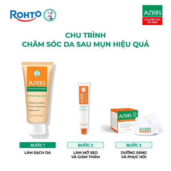 Làn da sau mụn cần được chăm sóc đúng cách để cải thiện tình trạng vết thâm, sẹo, da xỉn màu do mụn để lại. Bộ sản phẩm MENTHOLATUM ACNES VITAMIN với hệ Vitamin được kết hợp tối ưu, giúp dưỡng sáng và mờ sẹo thâm sau mụn hiệu quả.