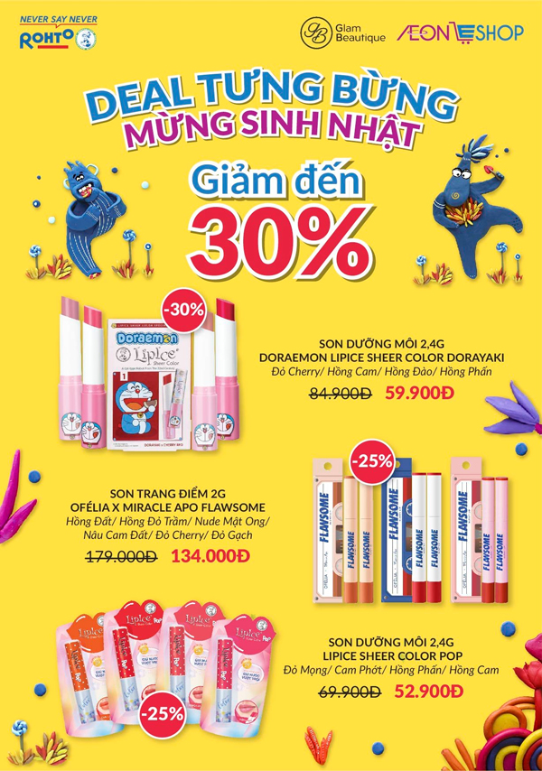 - Giảm giá đến 30%: Son dưỡng có màu tự nhiên LipIce Sheer Color x Doraemon, Set và single Son trang điểm Ofélia x Miracle Apo Flawsome Glow Lip