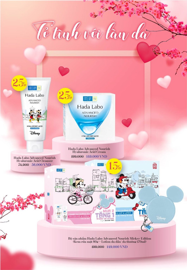- Giảm giá 25%: Kem dưỡng ẩm Hada Labo Advanced Nourish Hyaluronic Acid Cream 50g, Kem dưỡng trắng Hada Labo Perfect White Cream 50g.