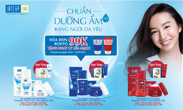 - Tặng 1 Sữa rửa mặt 80g cùng dòng và 1 Túi đựng mỹ phẩm trị giá 150k: Khi mua Bộ Dung dịch và Kem dưỡng ẩm Hada Labo Advanced Nourish Hyaluronic Acid hoặc Bộ Dung dịch và Kem dưỡng trắng Hada Labo Perfect White hoặc Bộ Dung dịch và Kem dưỡng cải thiện lão hóa da Hada Labo Pro Anti Aging α Lifting