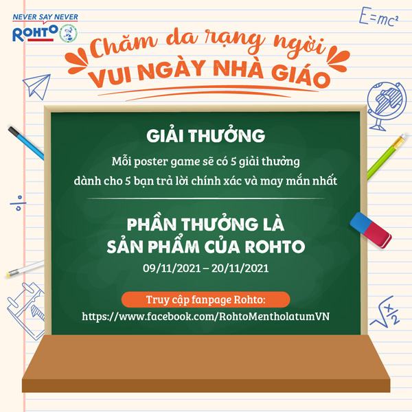 Tham gia ngay minigame hấp dẫn tháng 11 “Chăm Da Rạng Ngời - Vui Ngày Nhà Giáo” để nhận thật nhiều quà tặng dễ thương từ Rohto nhé!