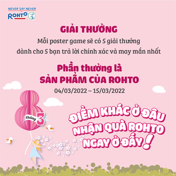 Tham gia ngay minigame hấp dẫn tháng 03 “Điểm khác ở đâu – Nhận quà Rohto ngay ở đấy” để nhận thật nhiều quà tặng dễ thương từ Rohto nhé!