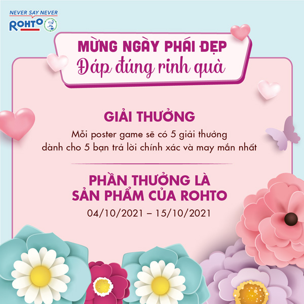 Tham gia ngay minigame hấp dẫn tháng 10 “Mừng Ngày Phái Đẹp - Đáp Đúng Rinh Quà” để nhận thật nhiều quà tặng dễ thương từ Rohto nhé!