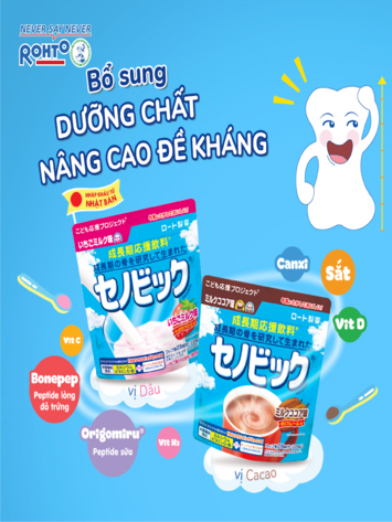 Senobic với 2 vị dâu và ca cao thơm ngon, bổ sung Sắt, Vitamin C, D, K2 cùng các dưỡng chất thiết yếu khác giúp cải thiện sức đề kháng, nâng cao hệ miễn dịch. Đồng thời các thành phần đặc biệt như BONEPEP, ORIGOMIRU, Canxi giúp phát triển khung xương chắc khoẻ và thúc đẩy chiều cao tối ưu.